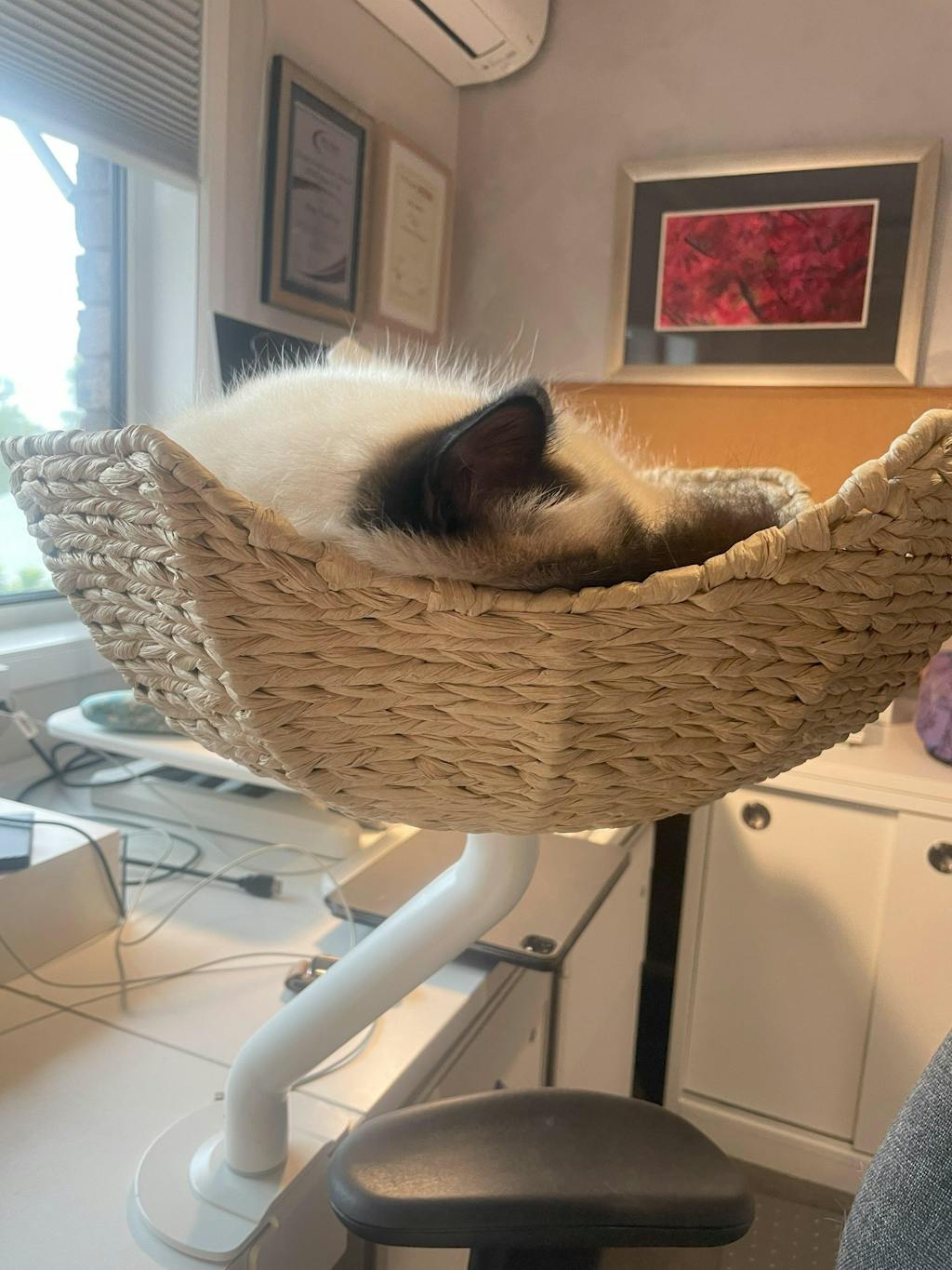 The ERGO PURRCH™️ weighs 3kg (arm mount) and additionally 1kg (handwoven bed option), or up to an additional 3.4kg (wooden bed option), and can support pets up to 20.4kg. It’s down to your cat’s weight and your table’s capacity to handle this combined weight, potentially up to 24kg. If your glass table can support it, you’re good to go! Always ensure safety first; it may be best to connect with the manufacturer of your glass table to confirm its capacity and see if it’s tempered glass.